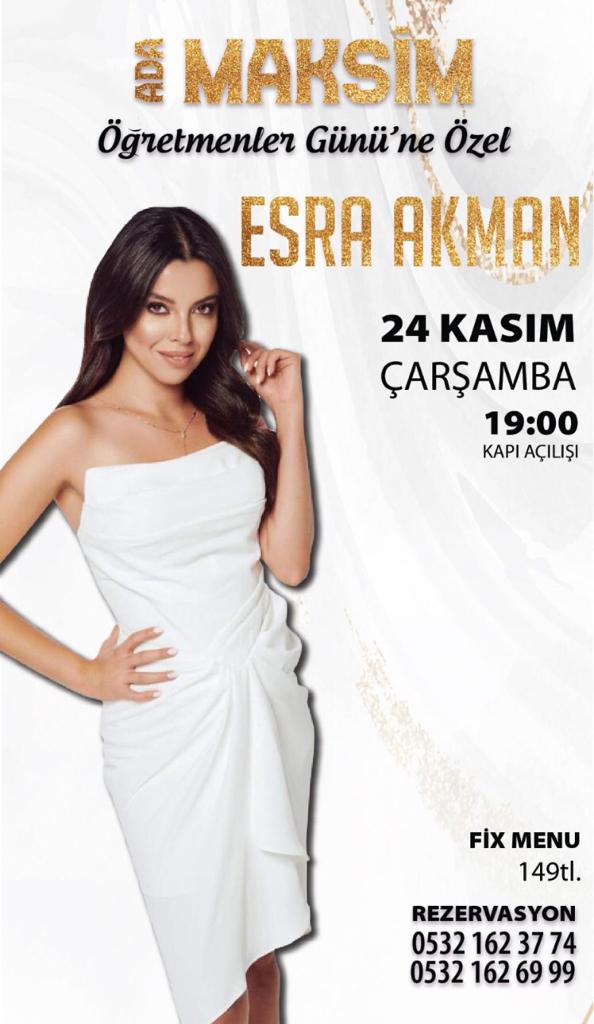 Ada Maksim işletme sahipleri Ayhan Balıkçı ve Cemal Beyaztaş, "Türk Sanat Müziği sanatçısı Esra Akman'ın sahneye çıkacağı özel gecede öğretmenlere yüzde 10 indirim yapılacak. Sürprizlerle dolu bir etkinlik olacak" dedi.