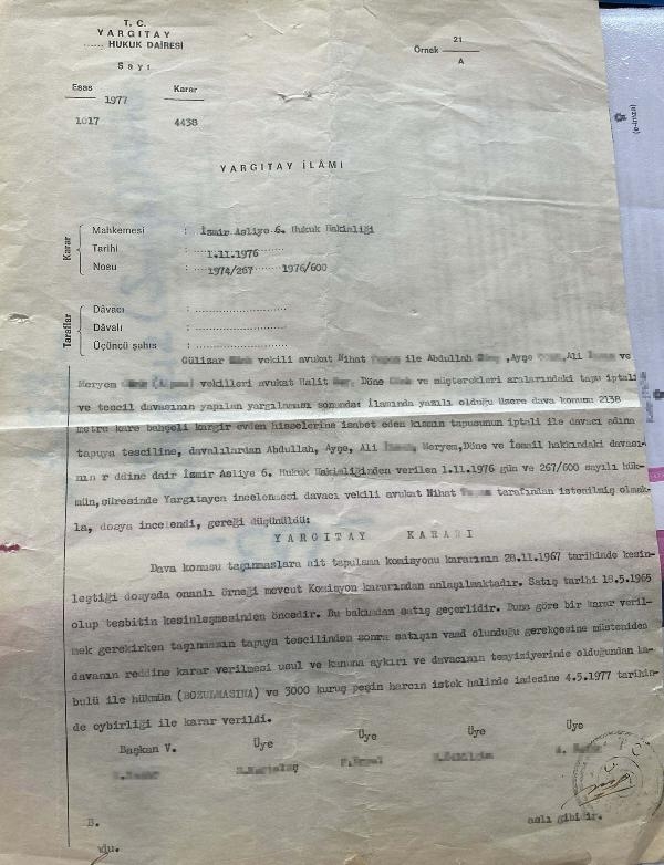 İZMİR'de Yargıtay'ca 1977'de bozulup yerel mahkemeye gönderilen tapu iptali ve tescil davası dosyası, rafta unutuldu. Tarafların ve taraf avukatlarının hayatını kaybettiği, şans eseri ortaya çıkan davanın görülmesine 45 yıl 9 ay 11 gün sonra yeniden yerel mahkemede devam edilecek.