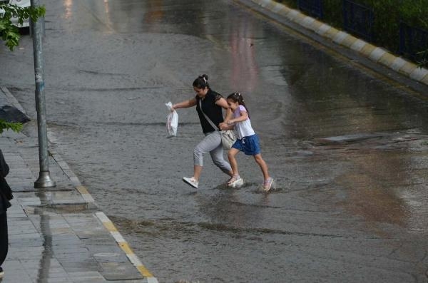 Aydın'ın Nazilli ilçesinde etkili olan kuvvetli rüzgar ve sağanak günlük yaşamı olumsuz etkilerken, mezarlıktaki bir çam ağacı yola devrildi, cadde ve sokaklarda su birikintileri oluştu.
