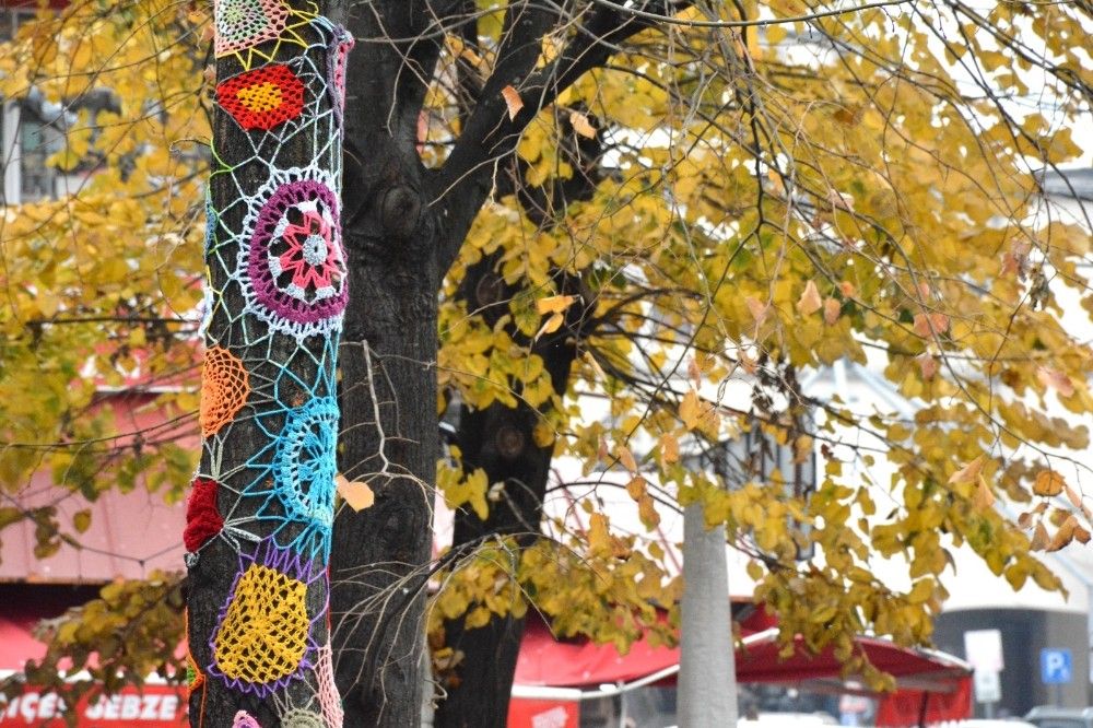 Zonguldak'ın Ereğli ilçesi Belediyesi ile Kent Konseyi Kadın Meclisi'nin öncülüğünde bir araya gelen kadınlar rengarenk ördükleri motifleri bir araya getirerek ağaçları süsledi