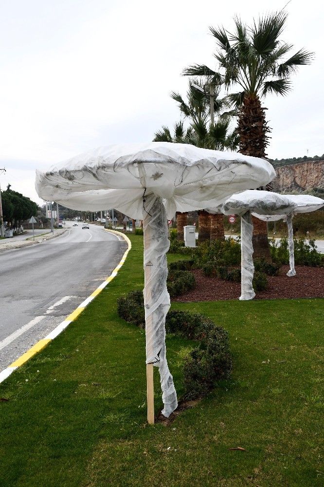 Kuşadası Belediyesi Park ve Bahçeler Müdürlüğü ekipleri, kent genelinde yaptıkları çalışmayla ağaçları elyaf ile kaplayıp soğuk hava ve dona karşı koruma altına aldı.