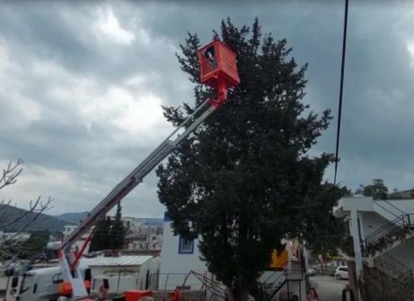 MUĞLA'nın Bodrum ilçesinde, ağaçta mahsur kalan kedi belediye ekiplerince vinç yardımıyla kurtarıldı. O anlar bir vatandaşın cep telefonu kamerası ile görüntülendi.