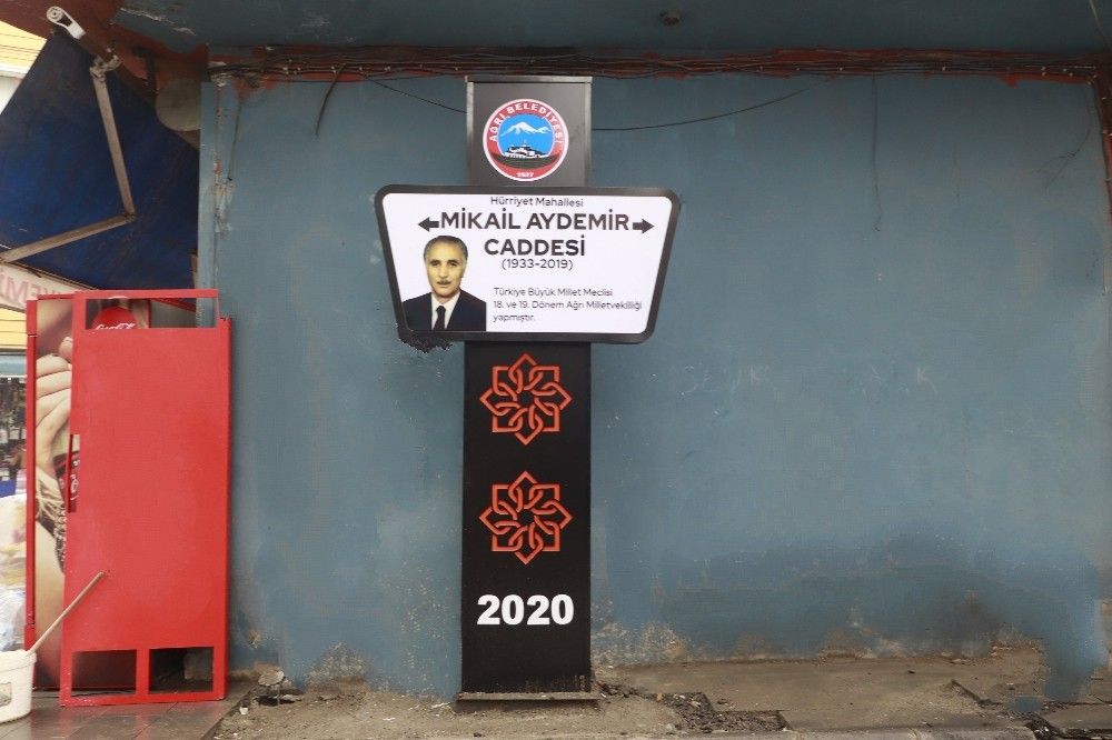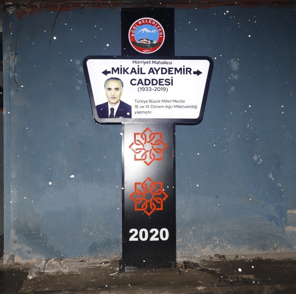 Ağrı Belediyesi, 48. Hükümet döneminde Sağlık Bakanlığı yapan Dr. Yaşar Eryılmaz ve 18-19. Dönem Milletvekili Mikail Aydemir Caddelerinde fotoğrafları ve özgeçmişlerinin yer aldığı dekoratif tabelaları cadde girişlerine monte etti.