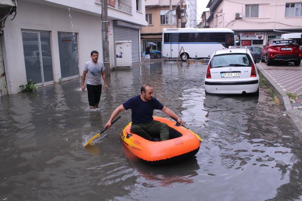 Bornova ilçesinde bir esnaf, su birikintisi olan sokaktan kürek kullanarak botla geçti. Yıllardır aynı sorunları yaşadıklarını söyleyen Aşın, "Dükkanlarımızı su basıyor. Defalarca İzmir Büyükşehir Belediyesi ve Bornova Belediyesine sorunu ilettik ama ilgilenen olmadı. Bir an önce sorunun çözülmesini istiyoruz. Botla sokaktan geçtik, insanlara da yardım ettik. Her sene aynı manzara olduğu için botu dükkanda tutuyorum" dedi.