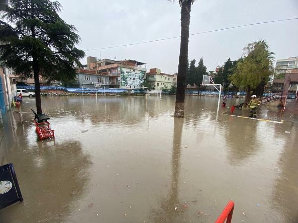 İzmir'de etkili olan sağanak nedeniyle Bornova ilçesindeki Mediha Mahmutbey Ortaokulu'nun bahçesi su ile doldu. İtfaiye ekiplerine durumu bildiren okul yönetimi, bahçeye dolan yağmur suları nedeniyle öğrencileri, okul çıkışı aileleri gelene kadar sınıflarda bekletti. Öğrenciler, öğretmenler eşliğinde okul girişine kadar araçlarıyla gelen ailelerine teslim edildi.