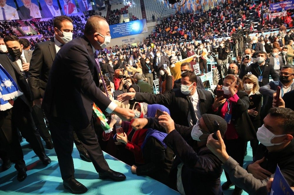 Kongre öncesi Bakan Çavuşoğlu ve beraberindekiler kurulan platformdan yürüyerek partilileri selamladı.