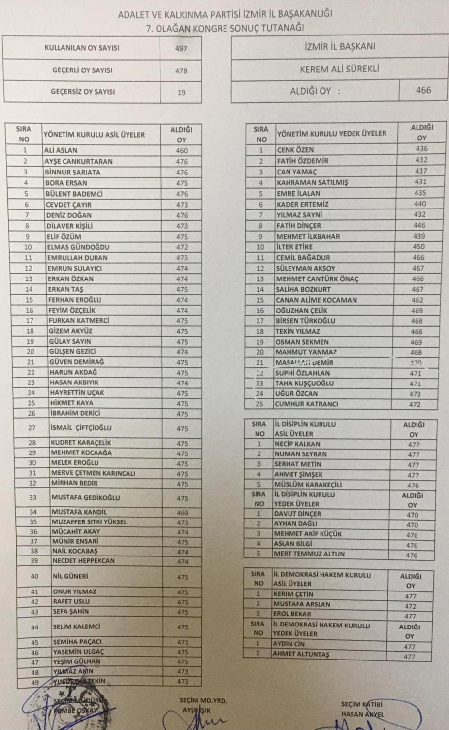 AK Parti İzmir 7’inci Olağan Kongresi’nde sonuçlar belli oldu. Tek aday olarak seçime giren Kerem Ali Sürekli’nin listesine 528 delegeden 497’si oy kullandı. Bu oyların 478’i geçerli sayıldı. Sürekli bu oyların 466’sını alarak yeniden Başkan seçildi. Özellikle yedek yönetim listesi çizik operasyonu yapılması nedeniyle liste tersine döndü. Operasyon sonucuna göre kişilerin aldığı oylar şöyle;