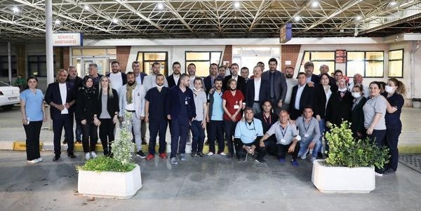 AK Parti İzmir İl Başkanı Kerem Ali Sürekli Selçuk, Balçova, Güzelbahçe ilçelerindeki ramazan buluşmalarının ardından Narlıdere ilçesinde Dokuz Eylül Üniversitesi Tıp Fakültesi Hastanesi sağlık çalışanlarıyla sohbet etti, sahur yaptı.