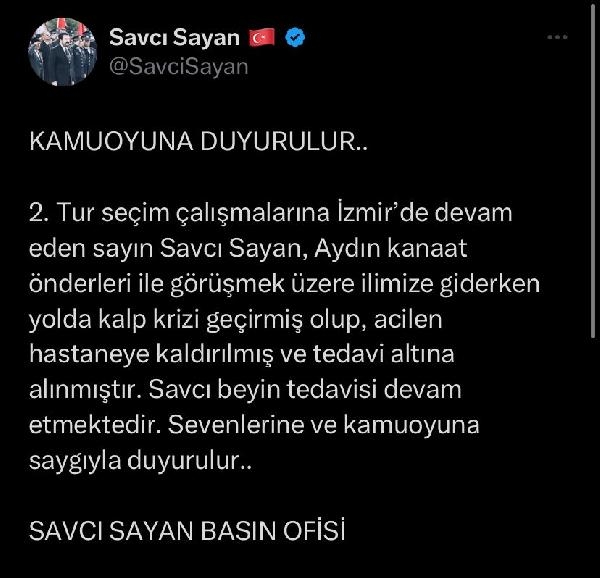 "2. tur seçim çalışmalarına İzmir'de devam eden sayın Savcı Sayan, Aydın kanaat önderleri ile görüşmek üzere ilimize giderken yolda kalp krizi geçirmiş olup, acilen hastaneye kaldırılmış ve tedavi altına alınmıştır. Savcı Bey'in tedavisi devam etmektedir."