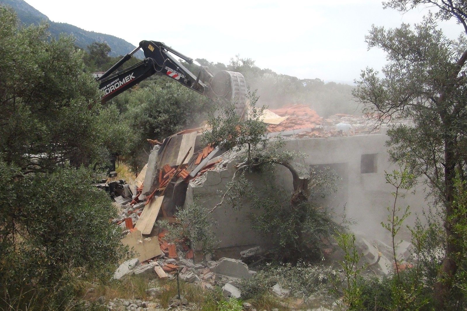 Menteşe İlçe Jandarma Komutanlığı ve Muğla İl Jandarma Komutanlığı Komando Taburu ekiplerinin güvenlik önlemi aldığı imara aykırı binaların yıkımları Menteşe Belediyesi Fen İşleri Müdürlüğü ekipleri tarafından gerçekleştiriliyor.