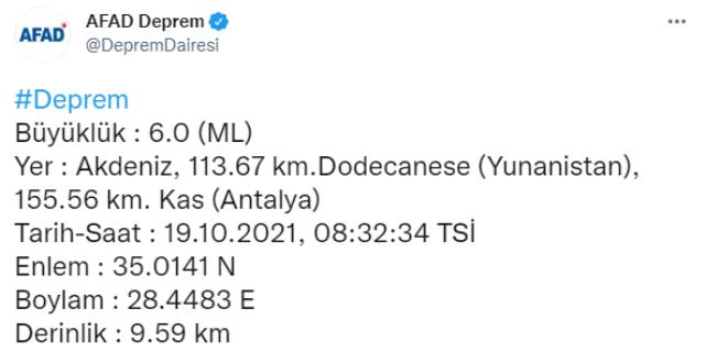 AFAD verilerine göre Akdeniz açıklarında 6 büyüklüğünde bir deprem meydana geldi. Sarsıntı Antalya ve çevresinde, Isparta, Aydın ve Denizli'de de hissedildi.
