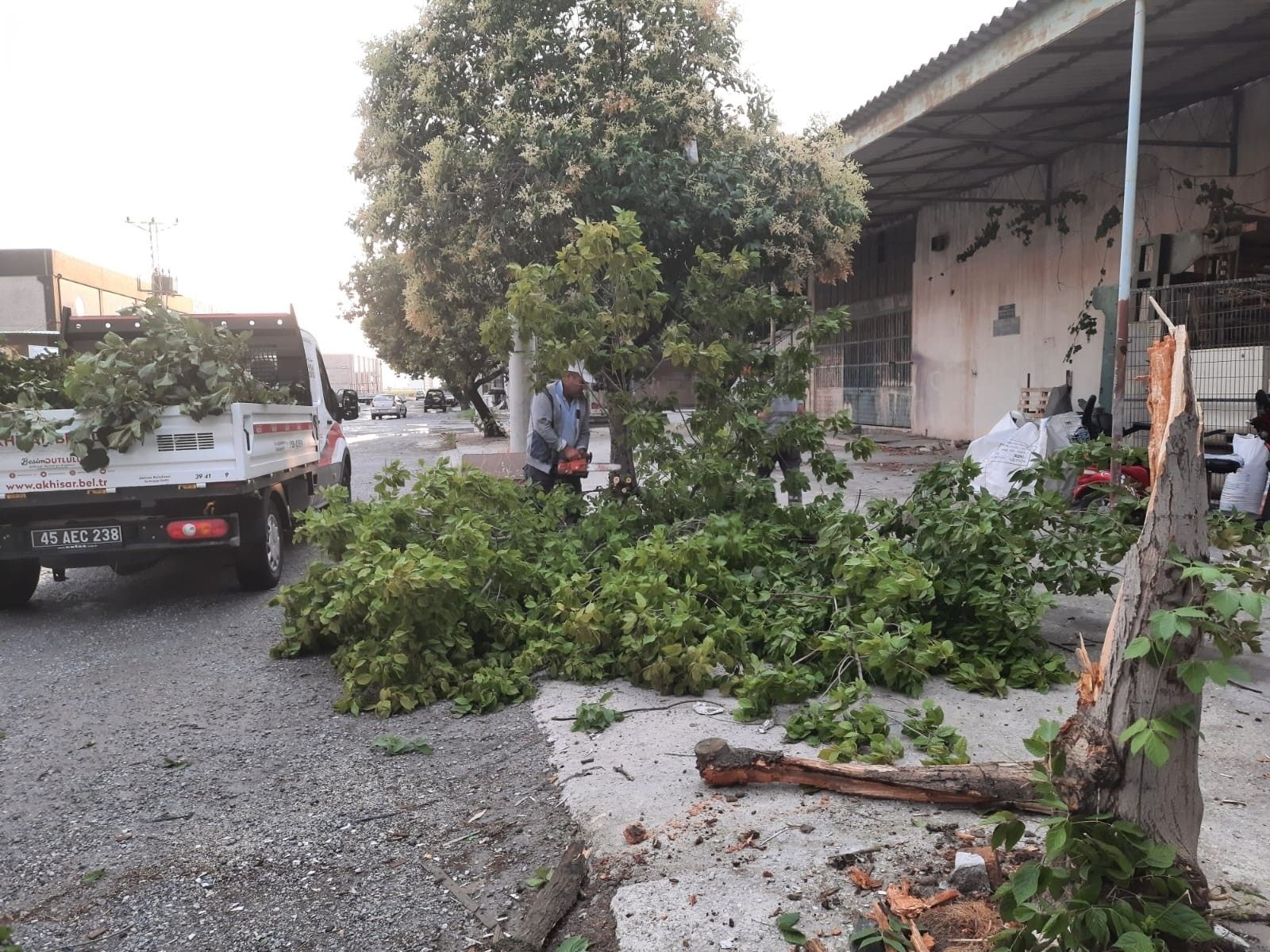 Akhisar'da kısa süreli fırtına ve şiddetli yağış yollarda ağaçları devirirken düşen yıldırım sonrası 2 kişi yaralandı, hayvanlar telef oldu.