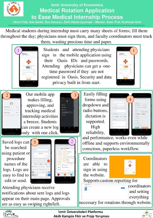 'Öğrenci kategorisinde, birinciliğe layık görülen İEÜ'lü gençler ise, hastanede görev yapan tıp öğrencilerinin günlük işlemlerini kaydedebilecekleri mobil uygulama geliştirilmesi üzerine odaklandı. Öğrencilerin Dr. Öğretim Üyesi Kutluhan Erol'un danışmanlığında hazırladığı projede, evrak doldurmak yerine mobil uygulama üzerinden yapılacak bu işlemlerin süreci hızlandıracağı ve bu sayede her gün yaşanan kağıt israfının da önüne geçileceği belirtildi.