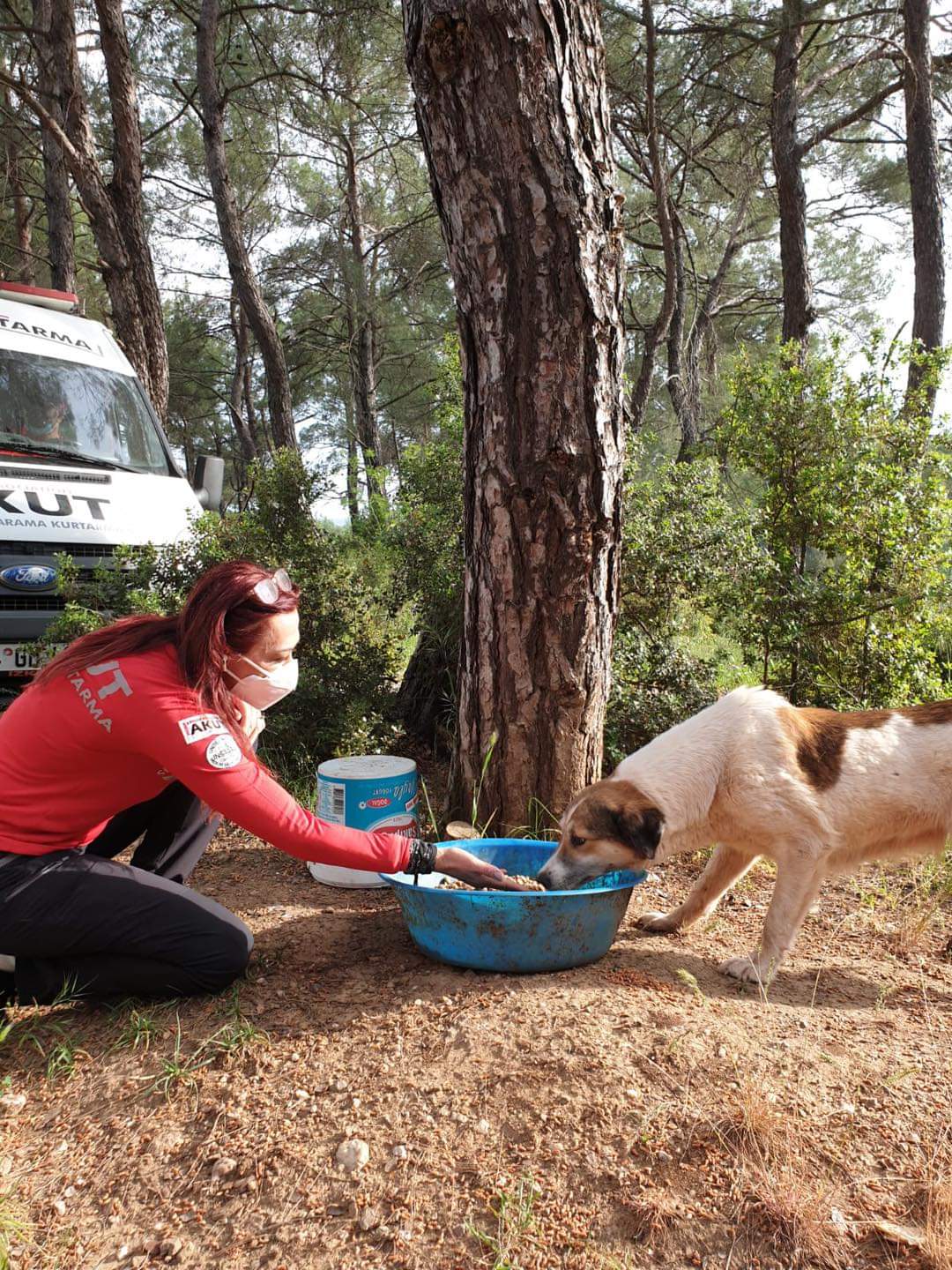 AKUT İzmir ekibi üyeleri, koronavirüs nedeniyle 17 günlük tam kapanma döneminde sokak hayvanlarını unutmadı. Ormanda zor durumda kalan köpeklere mama ve su götürdü.