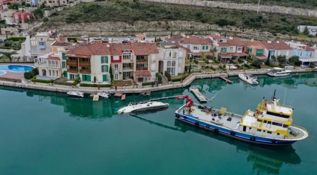 İzmir'in Çeşme ilçesinde 10 Şubat'ta etkili olan hortumda Alaçatı Port'ta demirliyken yan yatan ve ardından suya gömülen 15 metrelik yatın kurtarılması için hassas bir çalışma yürütüldü.