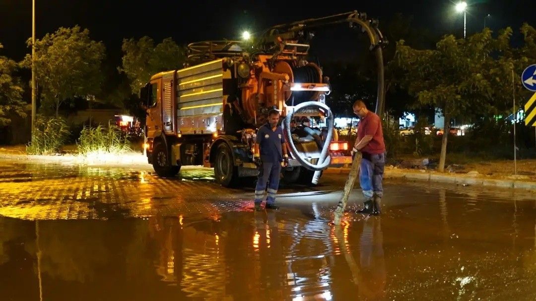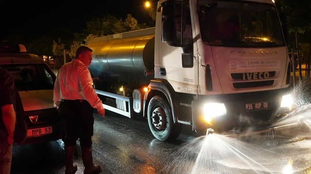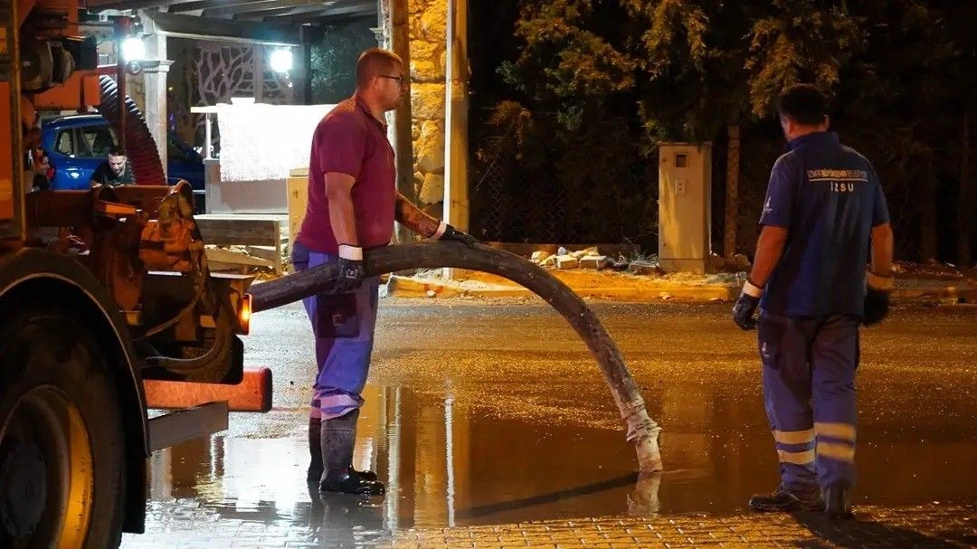 Alaçatı'da meydana gelen altyapıdaki taşmaya İZSU ekipleri kısa sürede müdahale ederken, Çeşme Belediye Başkanı Ekrem Oran'ın da başında olduğu ekipler, sokağı temizleyerek dezenfekte etti.