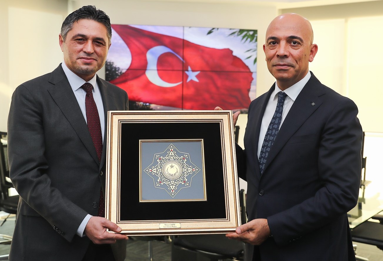 İzmir İl Emniyet Müdürü Mehmet Şahne, başkanlık makamında imzalanan protokol sonrası günün anısına Aliağa Belediye Başkanı Serkan Acar’a ay yıldız motiflerinden oluşan tablo hediye etti.