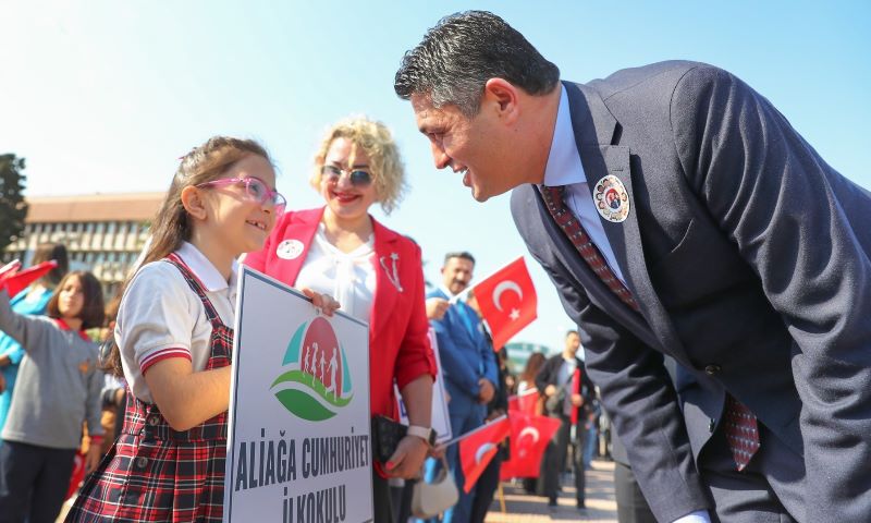 23 Nisan etkinlikleri Cumhuriyet Meydanı’nda İlçe Milli Eğitim Müdürü Dr. Erdoğan Akyüz’ün Atatürk Anıtı’na çelenk sunumuyla başladı. Resmi tören sonrasında kutlama programı Atatürk İlkokulu bahçesinde düzenlenen etkinliklerle devam etti. Okul bahçesinde organize edilen programa; Aliağa Kaymakamı Zekeriya Güney, Aliağa Belediye Başkanı Serkan Acar, Garnizon Komutanı Albay Faruk Altun, Aliağa İlçe Emniyet Müdürü Mustafa Ömür Avcı, Aliağa İlçe Jandarma Komutanı Yusuf Can Gökgöz, Şakran Cezaevi Jandarma Tabur Komutanı Volkan Gürler, İlçe Milli Eğitim Müdürü Dr. Erdoğan Akyüz, şehit yakınları, gaziler, askeri erkan, daire amirleri, sivil toplum kuruluşları, siyasi parti temsilcileri, öğretmenler, öğrenciler ve çok sayıda vatandaş katıldı.