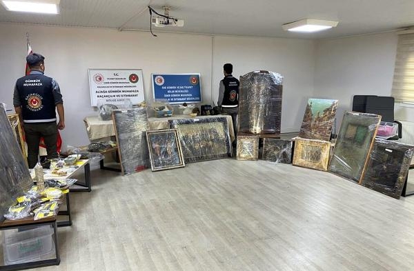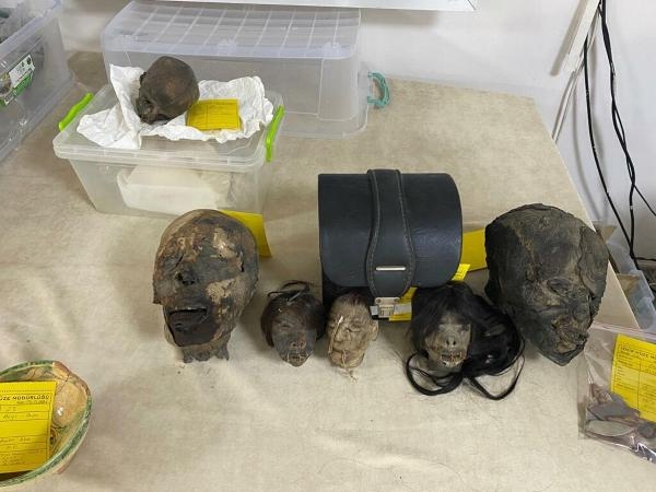 İZMİR'in Aliağa ilçesinde bir ev ve depoya yapılan operasyonlarda ele geçirilen farklı dönemlere ait tarihi eser ve 'tsantsa' olarak adlandırılan insan başlarının da içinde olduğu 1045 eserin bir kısmı raporlandı.