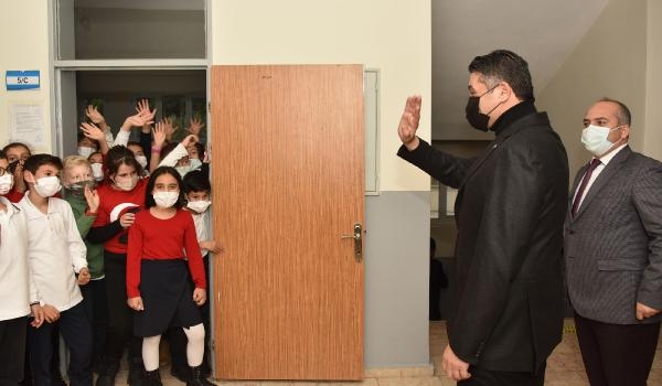 Kütüphane açılışlarına katılan Aliağa Belediye Başkanı Serkan Acar, öğrencilerle yakından ilgilendi.