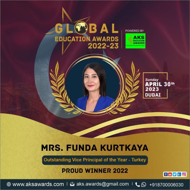 2022 AKS Education tarafından düzenlenen, dünyanın her köşesine aktif olarak ulaşmayı amaçlayan, mesleklerine katkılarda bulunan olağanüstü öğretmenleri tanımlayan ve tanıyan en prestijli organizasyonlardan ve ödüllerden biri olarak bilinen ‘Global Education Awards-Küresel Eğitim Ödülleri’ organizasyonunda ülkemizden dört öğretmen ödül almaya hak kazandı.