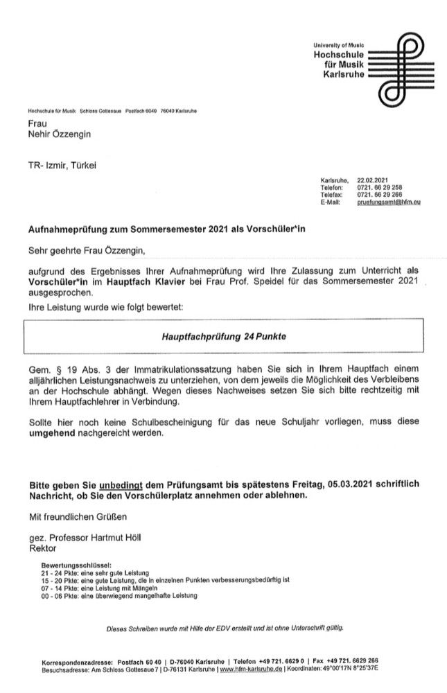 Yaşar Üniversitesi Sürekli Eğitim Merkezi (YÜSEM) Müzik Akademisi Piyano Bölümü Öğrencisi Nehir Özzengin, Almanya'nın saygın okullarından Karlsruhe Müzik Üniversitesinin kabul sınavlarında tam puan alarak mükemmel derece ile üniversitenin piyano bölümü öğrencisi olmaya hak kazandı. Sınav jürisindeki profesörler tarafından 'sıra dışı bir yetenek' olarak nitelendirilen 15 yaşındaki Nehir, tüm dünyada çok az genç yeteneğin ulaşabileceği bir başarıya imza attı.