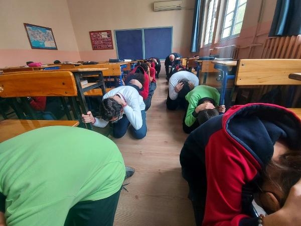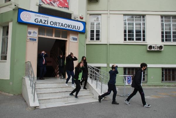 İçişleri Bakanlığı'nca Türkiye genelindeki tüm okullarda, '1-7 Mart Deprem Haftası' nedeniyle düzenlenen deprem tatbikatı, İzmir'de de gerçekleştirildi. Kent genelindeki 3 bin 737 okuldaki 728 bin öğrenci, olası depremde daha bilinçli davranmak için tatbikata katıldı. Konak ilçesindeki Gazi Ortaokulu'nda düzenlenen, AFAD ve Kızılay'ın da desteklediği tatbikata; İzmir Valisi Yavuz Selim Köşger, AFAD İl Müdürü Kartal Muhcı ve İl Milli Eğitim Müdürlü Mücahit Yentür katıldı. Öğrencilerle konuşan Vali Köşger, ileride vali olmak istediğini söyleyen 8'inci sınıf öğrencisi Muhammet Emir Çiftçi ile bir süre sohbet etti. Çocuklarla tatbikata katılan ve ilk sirenle sıranın yanında diz çöken Köşger, ikinci sesle sistemli şekilde okulun dışına çıkan öğrencilere eşlik etti.