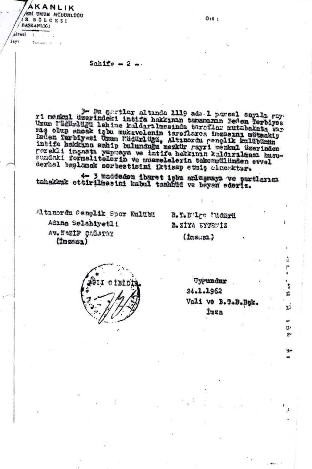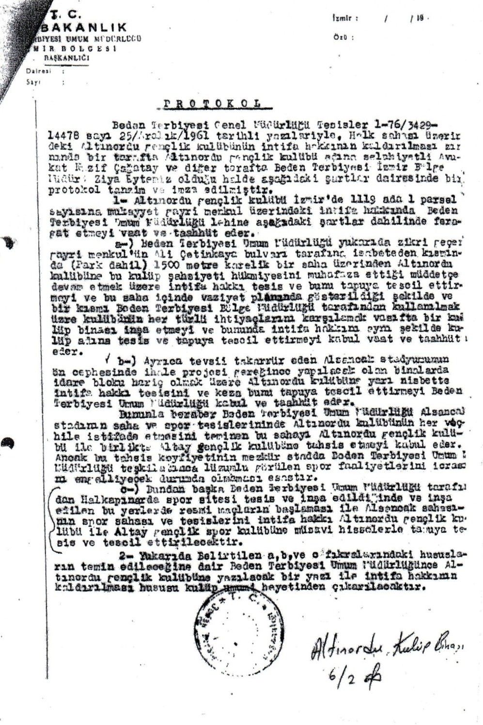 Altınordu Spor Kulübü yönetimi, 1962 yılında o dönemki adıyla Beden Terbiyesi Umum Müdürlüğü İzmir Bölgesi Başkanlığı ile yapılan protokole göre, İzmir Alsancak Stadı'nın bina ve saha kullanım hakkının yarısının kendilerine verilmesi gerektiğini açıkladı.