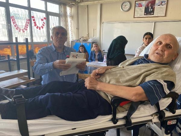 MANİSA'nın Turgutlu ilçesinde yatalak hasta Mehmet Ali Dündar (71), ambulans ile evinden alınıp, sedye ile getirildiği okulda oyunu kullandı.