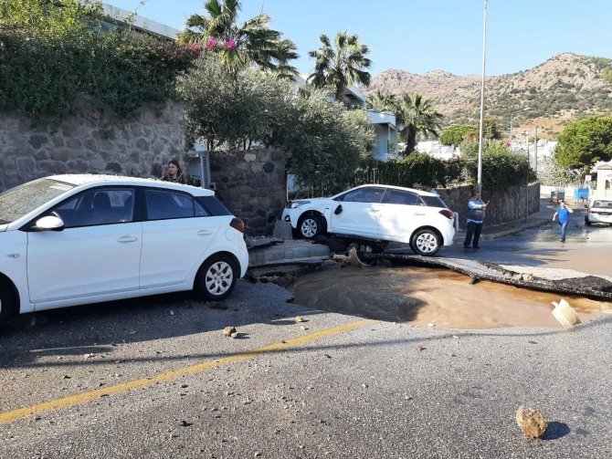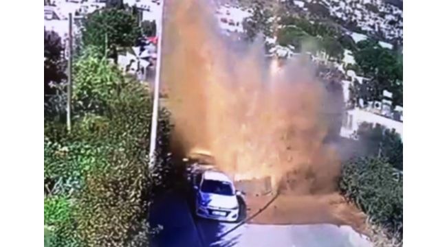 Muğla'nın Bodrum ilçesinde ana su hattı borusunun bomba gibi patladığı anlar güvenlik kamerasına yansıdı. Patlamanın etkisiyle asfaltlar yerinden sökülürken, 2 araçta maddi hasar oluştu.