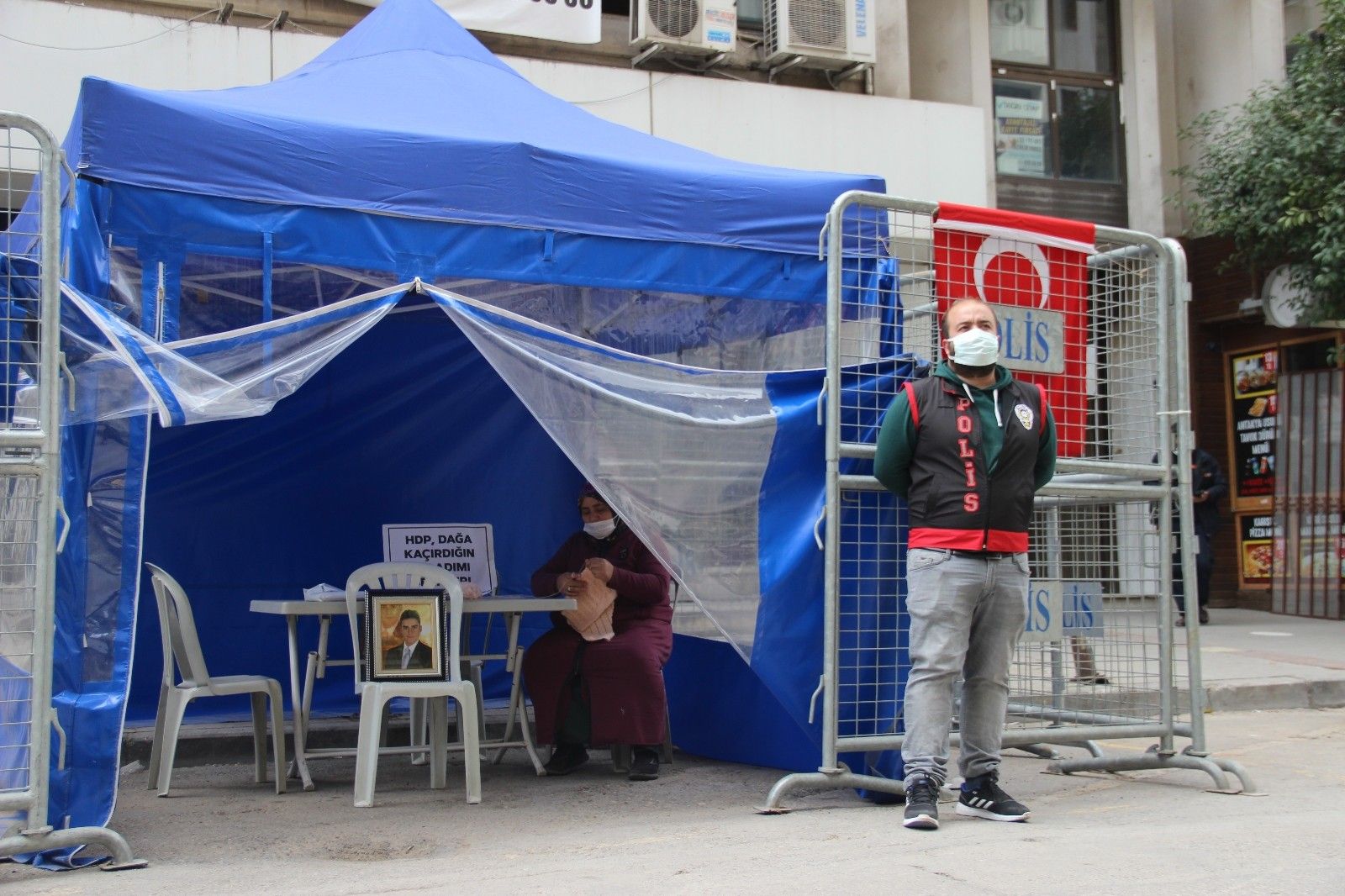 Terör örgütü PKK'nın çocuklarını dağa kaçırdığı gerekçesiyle Diyarbakır'da başlattıkları 'evlat nöbetinden' cesaret alarak İzmir'de de HDP İl Başkanlığı binası önüne gelen ailelerin evlat nöbeti sürüyor. Konak ilçesinde bulunan HDP İzmir önünde bulunan Muhbet Alemdar (48) da, oğlu Emrah Alemdar (25) için nöbet çadırı kurup, 'HDP dağa kaçırdığın evladımı geri ver' yazılı dövizle bekleyenler arasında. Oğlunun HDP aracılığıyla PKK tarafından kaçırıldığını söyleyen Muhbet Alemdar, oğlunun daha önce kaçmaya çalıştığını ancak yakalandığını da belirtti.