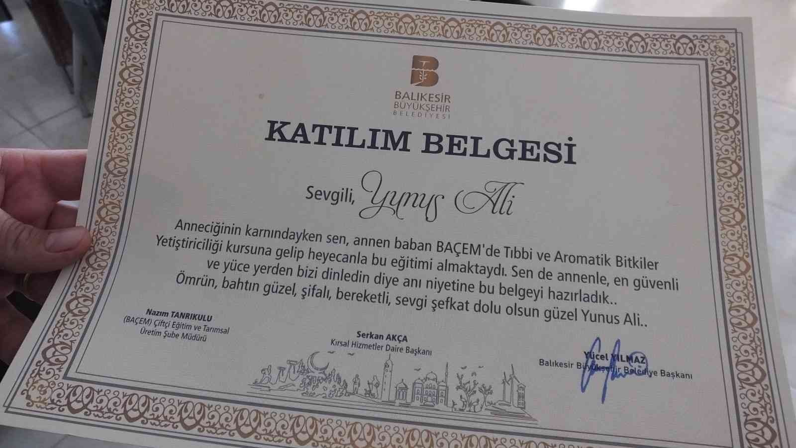 Sürpriz, Orman Endüstri Mühendisi baba Reha Sağ ile Edebiyat Fakültesi öğrencisi anne Şeyma Sağ'ı mutlu etti. Anne karnındaki bebek için hazırlanan belge de, " Sevgili Yunus Ali. Anneciğinin karnında iken sen, annen baban, BAÇEM'de Tıbbî ve Aromatik Bitkiler Yetiştiriciliği Kursuna gelip heyecanla bu eğitimi almaktaydı. Sen de, annenle, en güvenli ve yüce yerden bizi dinledin diye anı niyetine bu belgeyi hazırladık. Ömrün, bahtın güzel, şifalı, bereketli, sevgi, şefkat dolu olsun güzel Yunus Ali" yazıldı.