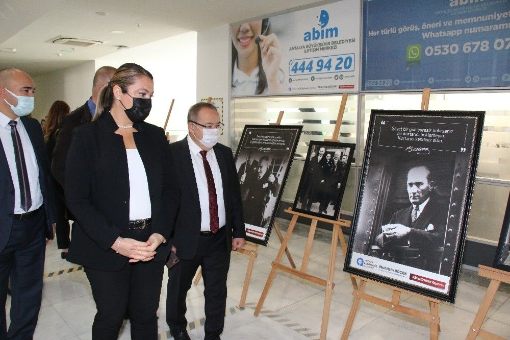 Törenin ardından Büyükşehir Belediyesi Genel Sekreteri Cansel Tuncer, Genel Sekreter Yardımcıları Mustafa Gürbüz ve Ramazan Demir ve Daire Başkanları ile birlikte Antalya Büyükşehir Belediyesi Fuayesi'nde Kültür ve Sosyal İşler Daire Başkanlığı tarafından düzenlenen Atatürk fotoğraflarından oluşan sergiyi gezdi.