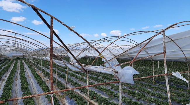 Antalya'da dün akşam saatlerinden bu yana etkili olan şiddetli rüzgar, Serik İlçesi'nde çilek seralarının naylon örtülerini uçurdu.