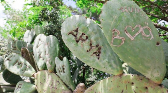 Türkiye’de ‘kaynanadili’ olarak da bilinen bu kaktüslere çiftler isimlerini yazıp, kalp şekli kazıyarak zarar veriyor.