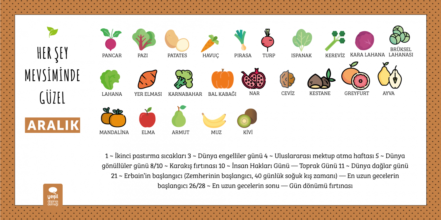 Yeşil Düşünce Derneği tarafından hazırlanan takvim hangi mevsimde neleri yememiz gerektiğini bir kez daha hatırlatıyor. Dernek tarafından yapılan paylaşımda “Yılın son ayı geldi, kestane mevsimi başladı! Vücudunuzun direnç kazanması için gerekli vitaminler ve mineraller pancar, kereviz, havuç gibi kök bitkilerde ve yeşil yapraklı sebzelerde bol miktarda bulunuyor” deniliyor.