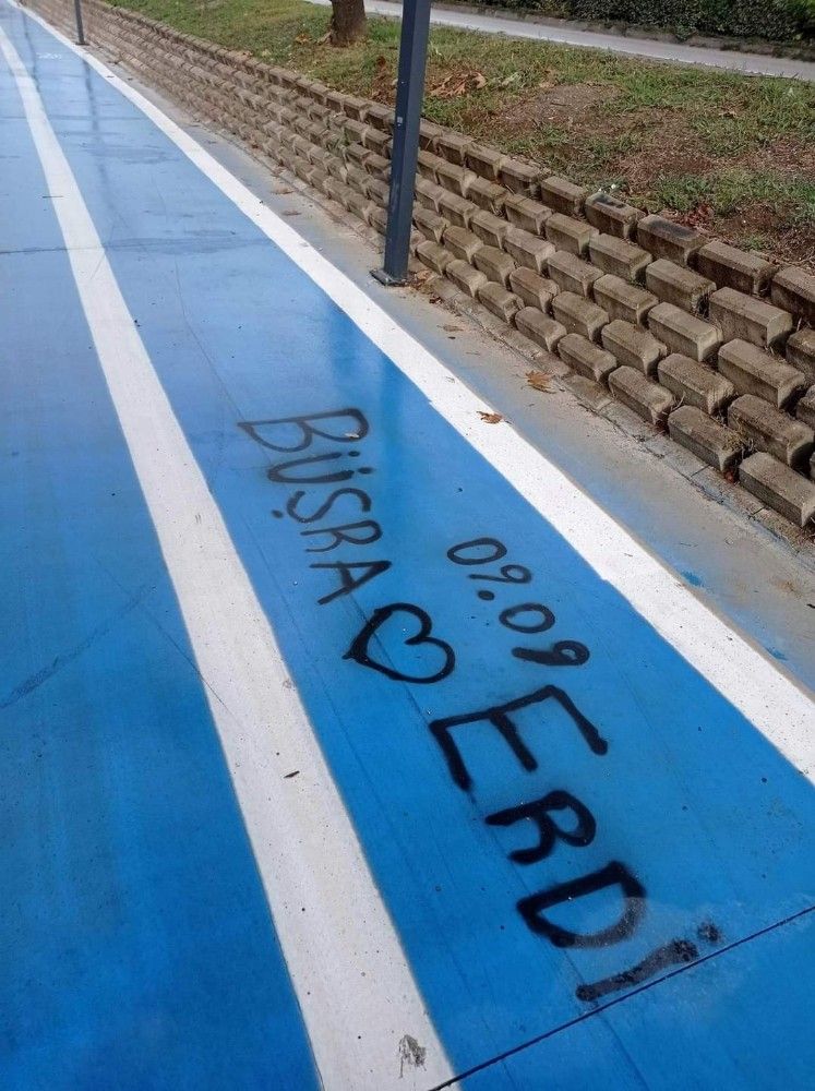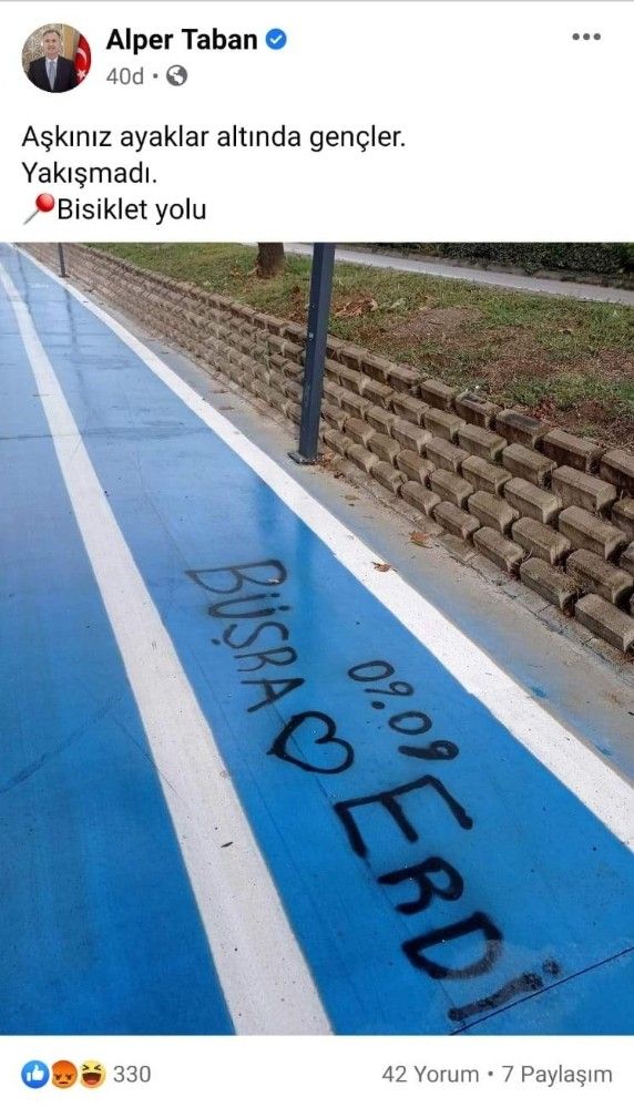 Yeni açılan bisiklet yoluna yazılan aşk mesajına olan tepkisini kibar bir şekilde dile getiren İnegöl Belediye Başkanı Alper Taban, "Büşra-Erdi" yazısını paylaşıp "Aşkınız ayaklar altında gençler" ikazında bulundu.