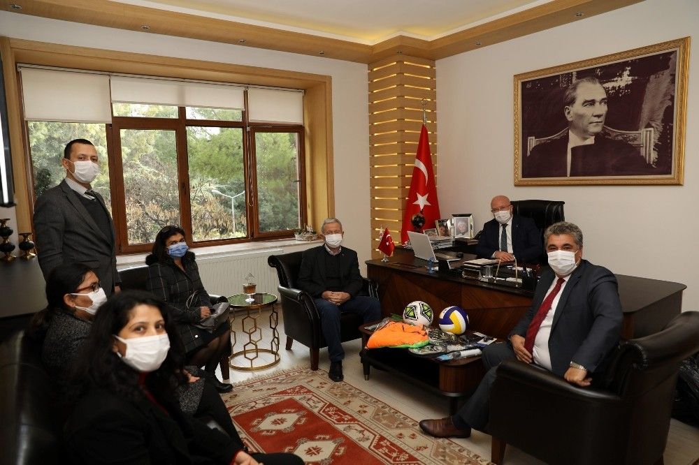 Menteşe Belediye Başkanı Bahattin Gümüş, Okul Müdürü Güven Özgül'e ikincilik ödüllerini belediye binasında takdim etti.