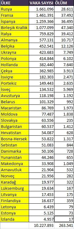 Avrupa'da koronavirüs vaka sayılarına ve ölüm oranlarına göre ilk 10 ülke şu şekilde sıralanıyor: