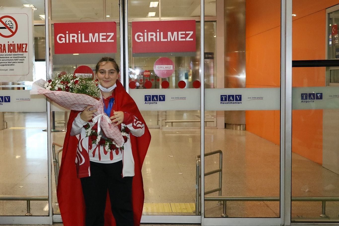 Avrupa Şampiyonu Burcu, çiçeklerle karşılandı