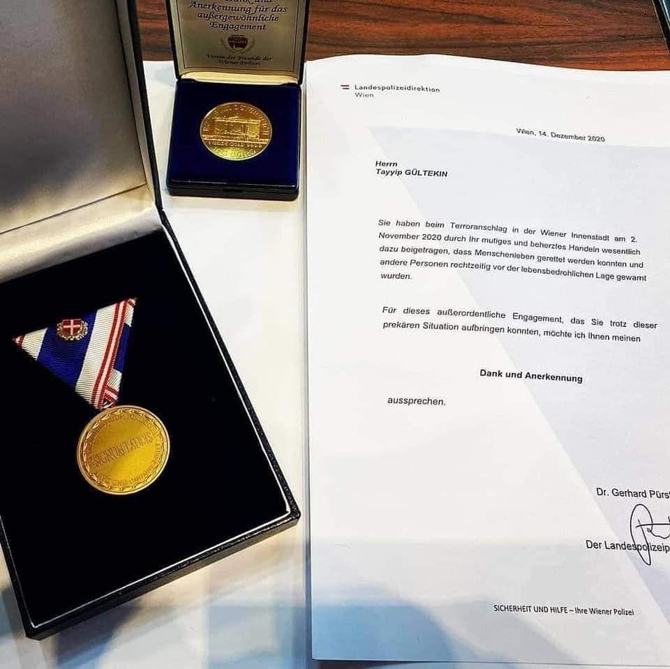 Avusturya'nın başkenti Viyana'da 2 Kasım tarihinde düzenlenen terör saldırısında 4 kişi hayatını kaybetmiş, 22 kişi yaralanmıştı. Saldırıda yaralılara yardımcı olan ve büyük bir kahramanlık gösteren Türk gençleri Recep Tayyip Gültekin ve Mikail Özen'e Viyana Eyalet Polis Teşkilat Başkanı Dr. Gerhard Pürstl tarafından şeref madalyası verildi. Terör saldırısı sırasında Gültekin ve Özen, hayatlarını riske atarak yaralı bir polis memurunu ambulansa taşımış ve yaşlı bir kadını çatışma bölgesinden çıkarmıştı. Gençler olayın ardından yaptıkları açıklamada, "Aynı olay yine olsa biz yine insanları kurtarmak için bu hareketi yaparız" ifadelerini kullanmıştı.