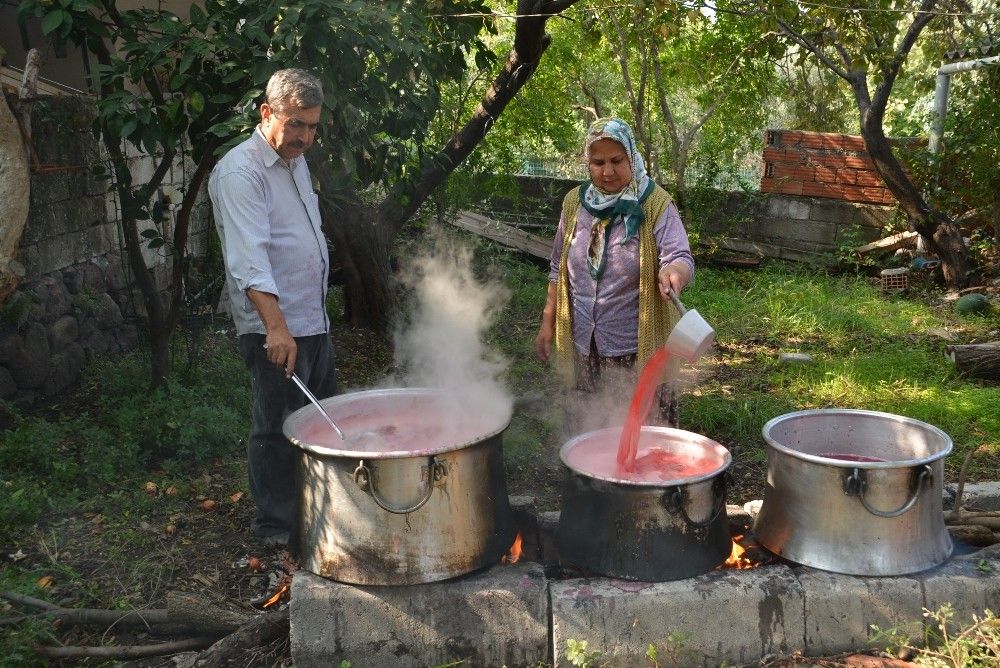 Yemek ve salatalara lezzet katmak için sofraların vazgeçilmez aroması haline gelen nar ekşisini tamamen doğal ve geleneksel yöntemlerle hazırladıklarını ve özellikle virüs salgınından sonra çok fazla rağbet gördüğünü belirten Mustafa Ballı, "Mevsimin durumuna göre ekim ayında olgunlaşmaya başlayan narlar önce bahçelerden toplanıyor. Dalından tek tek topladığımız narları daha sonra taneleyip suyunu sıkıyoruz. Ezerek çıkardığımız narın suyunu daha sonra koyulaşana kadar kazanlarda odun ateşinde kaynatarak ekşisini yapıyoruz" dedi.