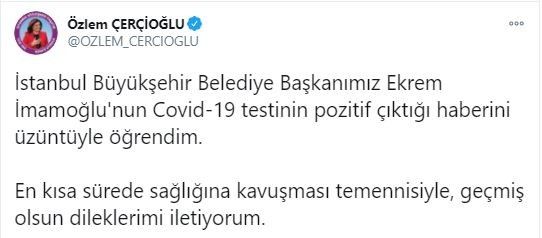 İmamoğlu'nun korona testi sonucunun pozitif çıktığını üzüntüyle öğrendiği ifade ederek, geçmiş olsun dileklerini ileten Aydın Büyükşehir Belediye Başkanı Özlem Çerçioğlu; "İstanbul Büyükşehir Belediye Başkanımız Ekrem İmamoğlu'nun Covid-19 testinin pozitif çıktığı haberini üzüntüyle öğrendim. En kısa sürede sağlığına kavuşması temennisiyle, geçmiş olsun dileklerimi iletiyorum" dedi.