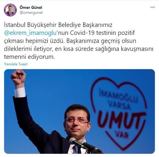 İmamoğlu için bir mesaj da Kuşadası Belediye Başkanı Ömer Günel'den geldi. Başkan İmamoğlu'nun en kısa sürede sağlığına kavuşma temennisinde bulunan Başkan Günel de, paylaşımında "İstanbul Büyükşehir Belediye Başkanımız Ekrem İmamoğlu'nun Covid-19 testinin pozitif çıkması hepimizi üzdü. Başkanımıza geçmiş olsun dileklerimi iletiyor, en kısa sürede sağlığına kavuşmasını temenni ediyorum" ifadelerine yer verdi.