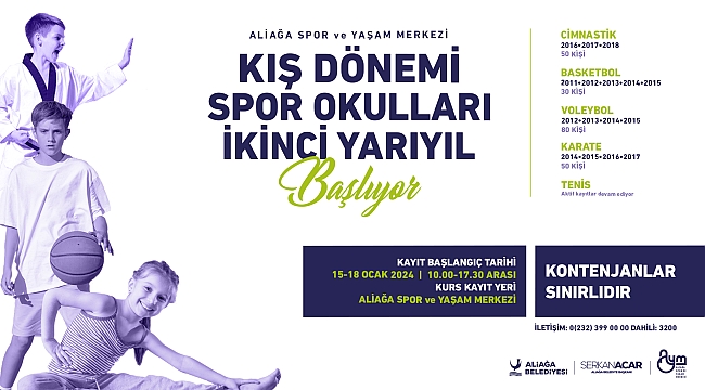Cimnastik, karate, basketbol, tenis ve voleybol branşlarında açılacak kurslara katılmak isteyen öğrenciler, 15-18 Ocak 2023 tarihlerinde 10.00 – 17.30 saatleri arasında Aliağa Spor ve Yaşam Merkezi’ne müracaat edebilirler.
