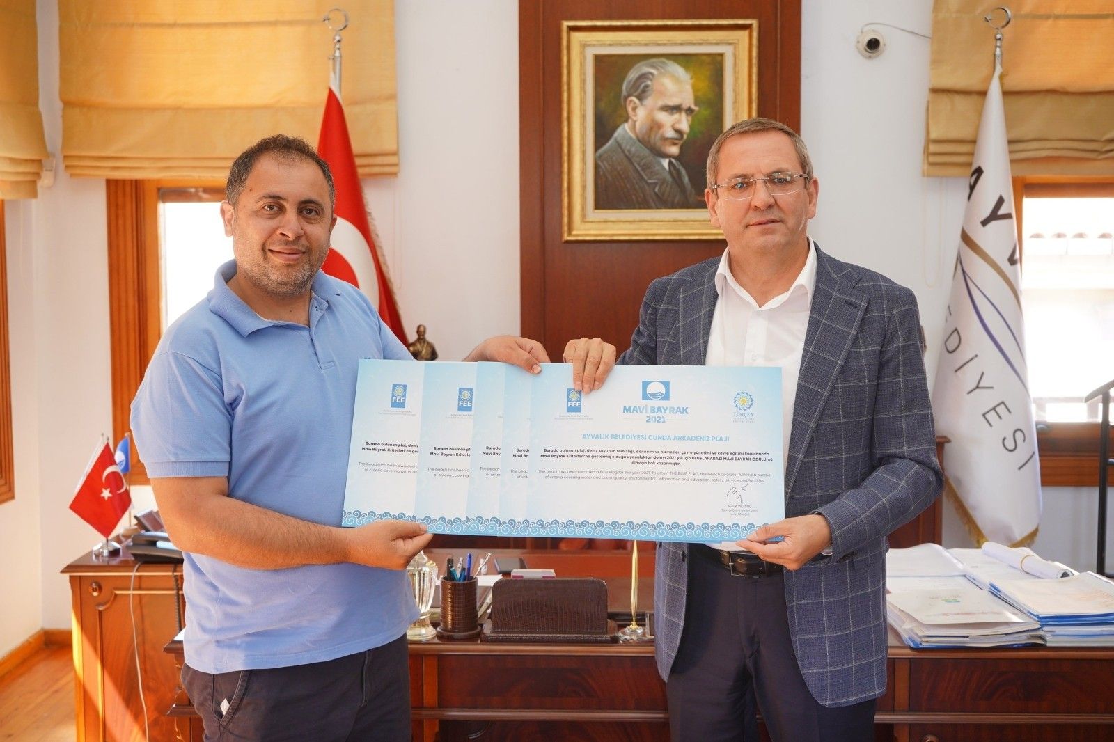 İki yılda, belediyenin "Mavi Bayrak" sayısını birden beşe çıkarmanın haklı gururunu yaşadıklarını belirten Ayvalık Belediye Başkanı Mesut Ergin, "Bu yıl ilk kez "Mavi Bayrak" alan Cunda Arka Deniz Plajı ile Altınova Kum Adası Plajı'nın onur belgelerini Türkiye Çevre Eğitim Vakfı (TÜRÇEV) Ege Koordinatörü Doğan Karataş'ın elinden aldık. Geçtiğimiz yıl mavi bayrak alan; Duba, Kapri ve Paşa Limanı plajlarının bu yıl da "Mavi Bayrak" almasıyla birlikte, Belediyemiz İşletme ve İştirakler Müdürlüğü'ne ait Mavi Bayraklı plaj sayımız beşe yükseldi" dedi.