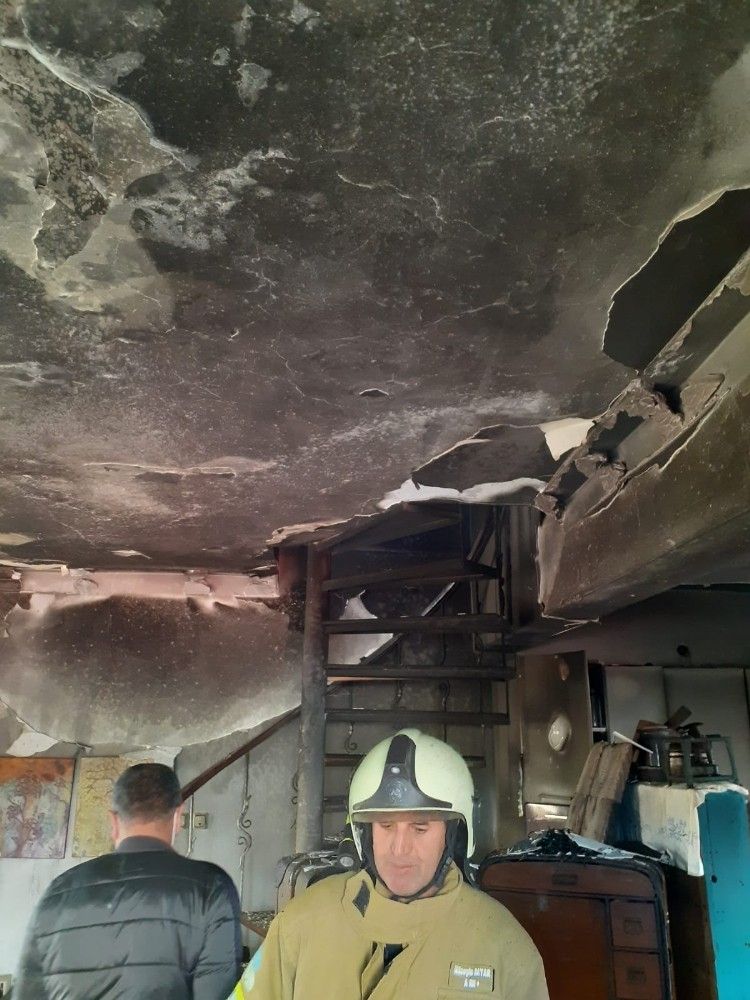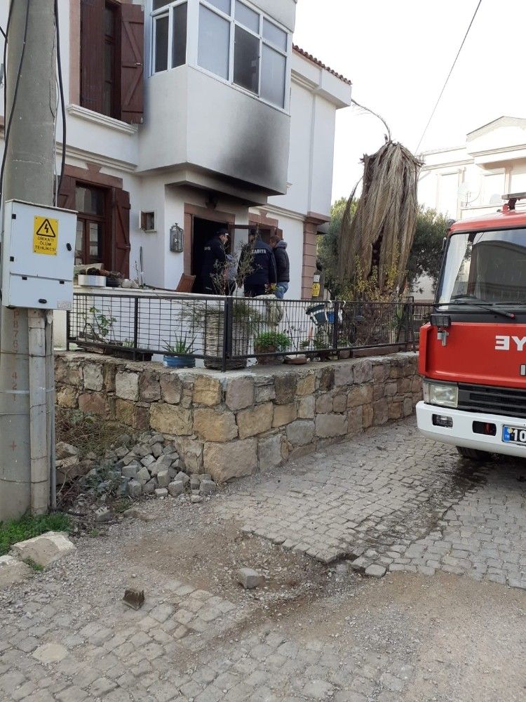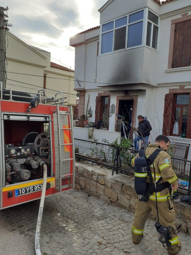 Balıkesir'in Ayvalık ilçesinde iki katlı bir evde çıkan yangın itfaiye ekiplerinin zamanında müdahalesiyle söndürüldü. Yangında evde mahsur kalan köpek itfaiye erleri tarafından kurtarıldı.