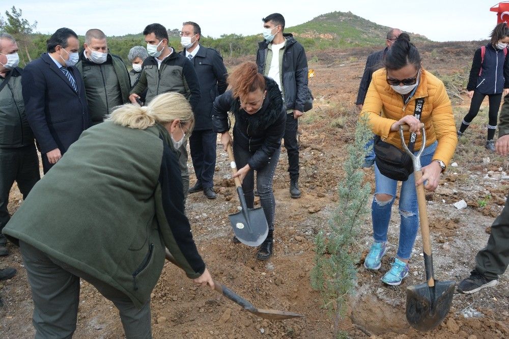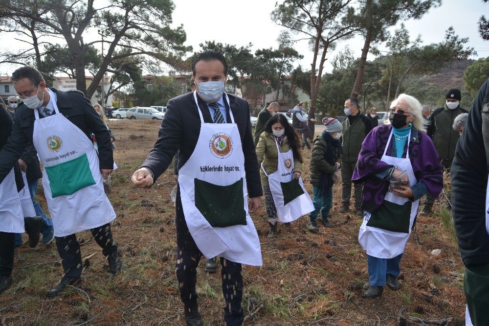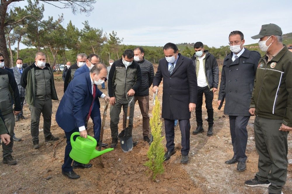 Konuşmaların ardından kendi kendine ağaçlanacak alanlara ağaç tohumları serpiştiren protokol ve beraberindekiler, daha sonra da fidanlarla ağaçlandırılacak bölgelerde de çam ağacı fidanlarını toprakla buluşturdu.