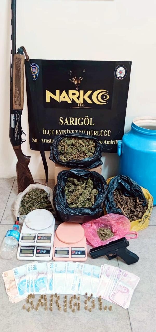 Manisa Emniyet Müdürlüğü Narkotik Suçlarla Mücadele Şubesi ve Sarıgöl Emniyet Müdürlüğü ekipleri, istihbarat çalışmasıyla ilçede yaşayan D.K.'nin, bağ evinde ve iş yerinde uyuşturucu üreterek sattığını belirledi. Dün her iki adrese, özel eğitimli narkotik köpekleriyle eş zamanlı operasyon düzenlendi. Bağ evinde yapılan aramada; bahçedeki arı kovanına gizlenen toplam 1 kilo 659 gram esrar, ruhsatsız 9 mm çapında 1 tabanca, 1 av tüfeği, 53 fişek, esrar tartmada kullanıldığı belirlenen 3 hassas terazi, 1 uyuşturucu madde kullanmaya yarayan aparat ele geçirildi. D.K. ise gözaltına alındı. Polisteki işlemlerinin ardından adliye sevk edilen D.K. tutuklanıp, Alaşehir M Tipi Cezaevi'ne götürüldü. (DHA)