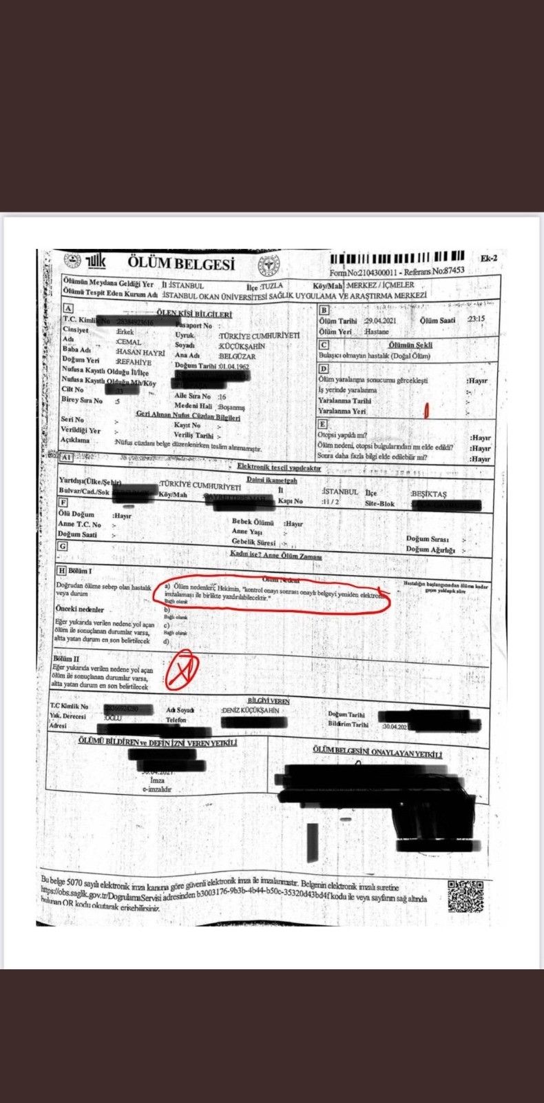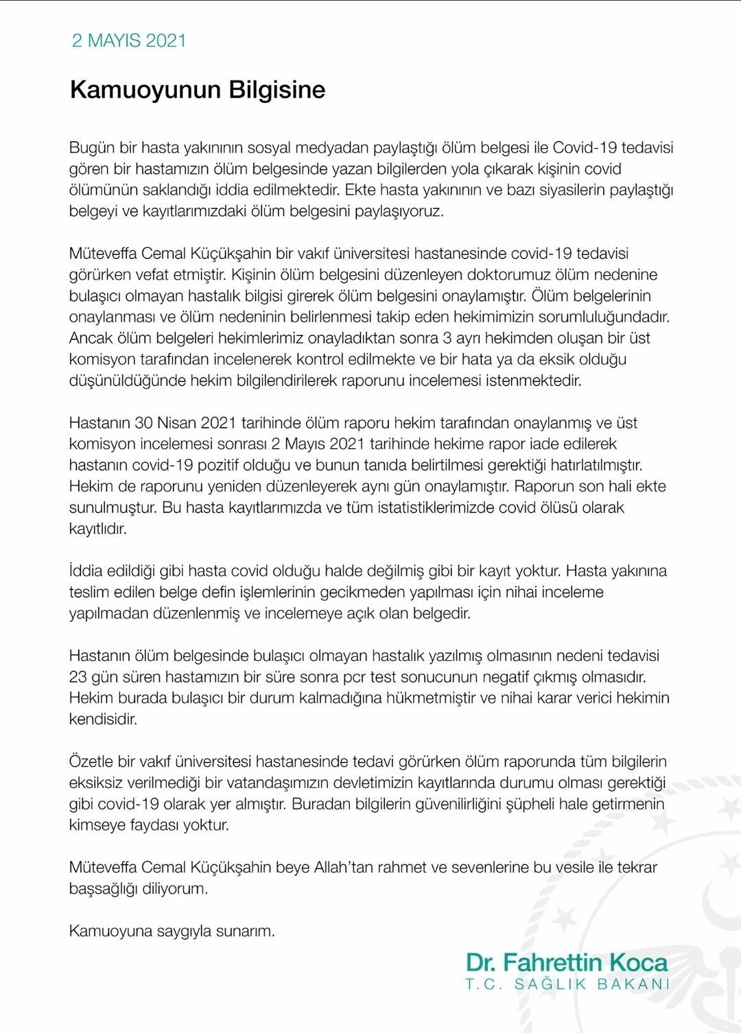 Müteveffa Cemal Küçükşahin bir vakıf üniversitesi hastanesinde covid-19 tedavisi görürken vefat etmiştir. Kişinin ölüm belgesini düzenleyen doktorumuz ölüm nedenine bulaşıcı olmayan hastalık bilgisi girerek ölüm belgesini onaylamıştır. Ölüm belgelerinin onaylanması ve ölüm nedeninin belirlenmesi takip eden hekimimizin sorumluluğundadır. Ancak ölüm belgeleri hekimlerimiz onayladıktan sonra 3 ayrı hekimden oluşan bir üst komisyon tarafından incelenerek kontrol edilmekte ve bir hata ya da eksik olduğu düşünüldüğünde hekim bilgilendirilerek raporunu incelemesi istenmektedir.